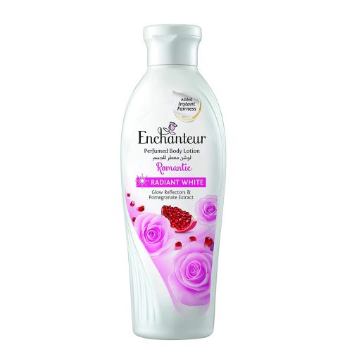 Mesmerize your senses with the all new Enchanteur Romantic Radiant White Perfumed Body Lotion imbued with Pomegranate Extract and Instant Glow Reflectors. It evens out your skin tone, provides instant fairness & strengthens the barrier between the skin. It also provides UV protection that prevents your skin from further darkening. This is available in the irresistible fragrance of Enchanteur Romantic.