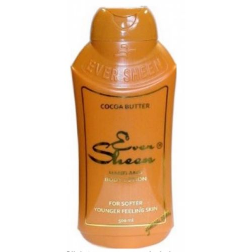 Ever Sheen Hand and Body Cocoa Butter Lotion: For a softer younger feeling skin. Lotion helps relieve streched skin during and after pregnancy. Helps prevent stretch marks. Soothes and softens dry irritated chapped or sun-burned skin. 16.9oz/500ml. MADE IN Cote d'Ivoire. Ingredients: Demineralised water: Minerla oil, Sobitol Paridol, Citric Acid, Empiwax, C16, Cocoa butter, Fragrance.