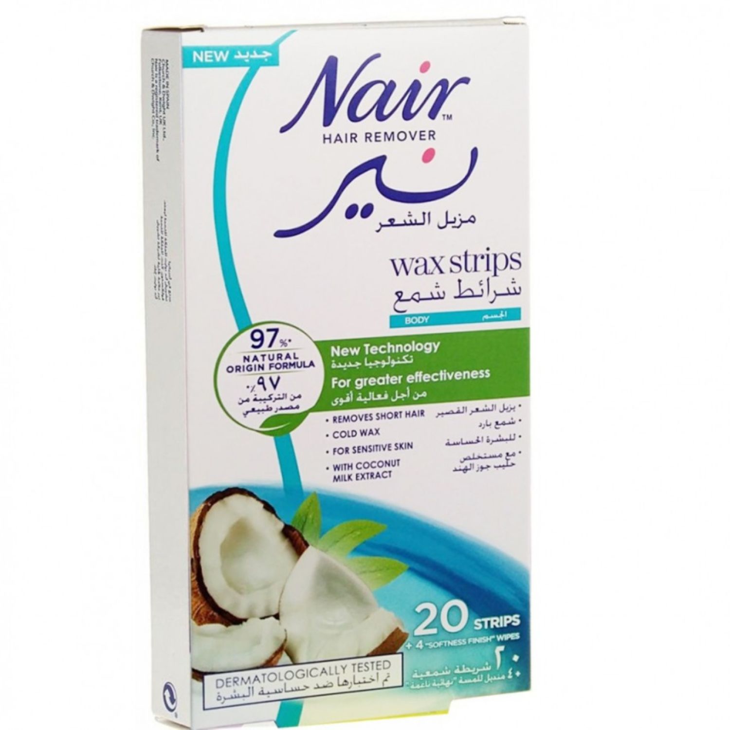 The new Nair range extracts a piece from nature for your peace of mind. Nair cold wax strips with Coconut Milk Extract is suitable for sensitive skin and made with 97% natural origin ingredients formula that is dermatologically tested. Remove short unwanted hair from the roots and keep your skin smooth for up to 4 weeks. 20 cold wax strips for hair removal from your legs, arms, underarms and bikini area. Accompanied with 4 soft finishing post-wax wipes that removes any wax residue and moisturizes your skin.