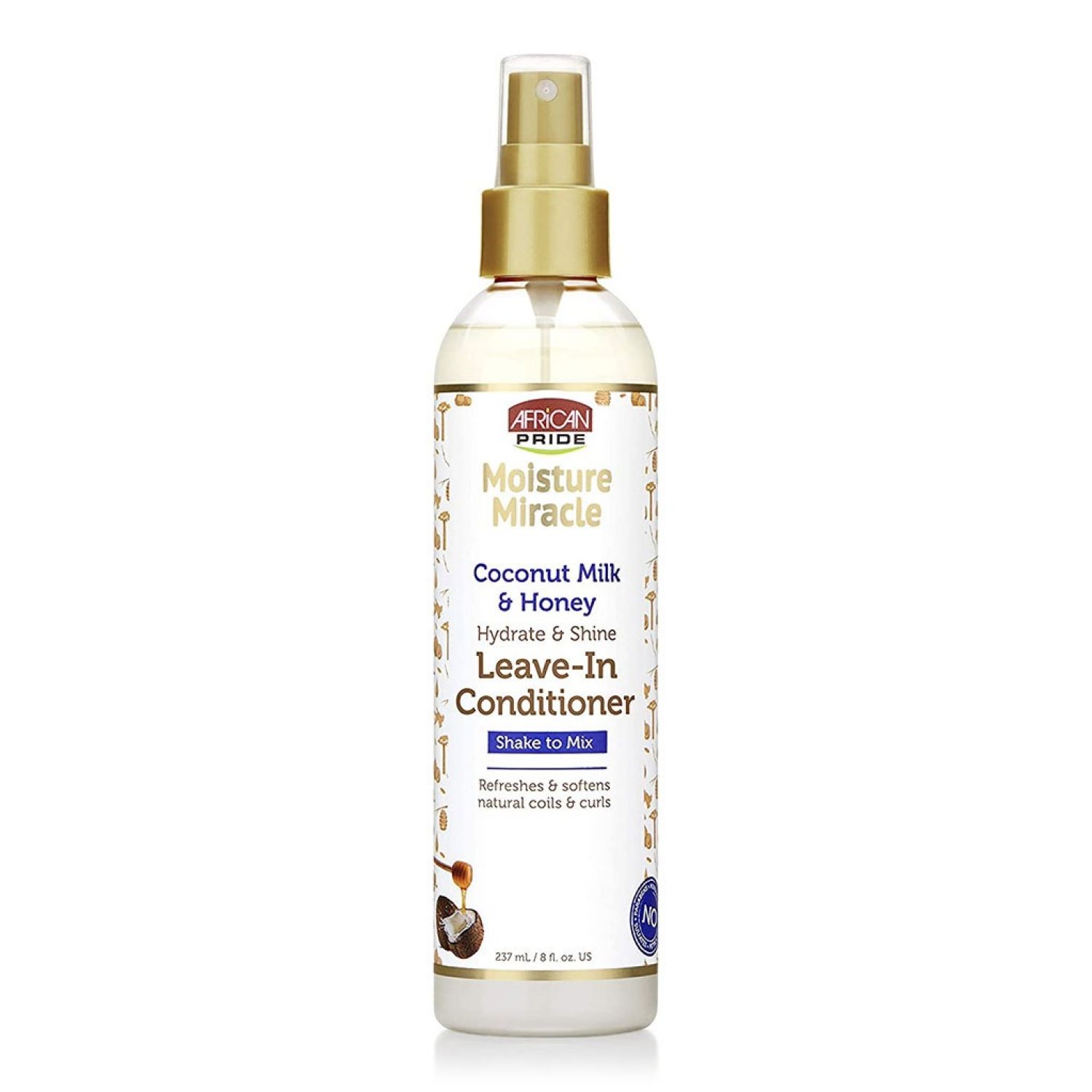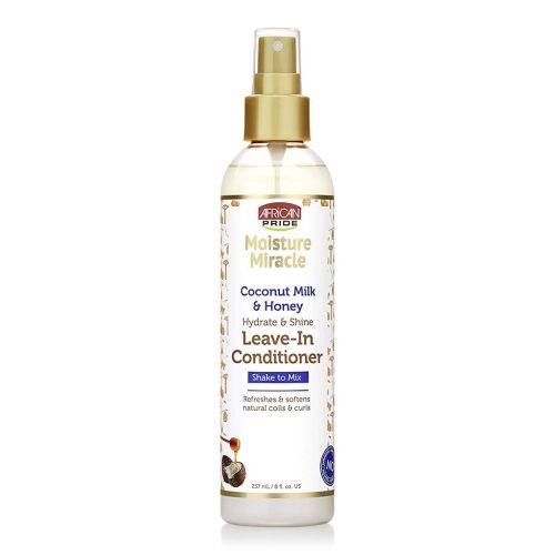 African Pride Moisture Miracle Coconut Milk & Honey Leave–In Conditioner is a lightweight blend of hydrating Coconut Milk & African Honey that replenishes moisture, adds shine and softens; leaving your hair manageable, defined, & beautiful.