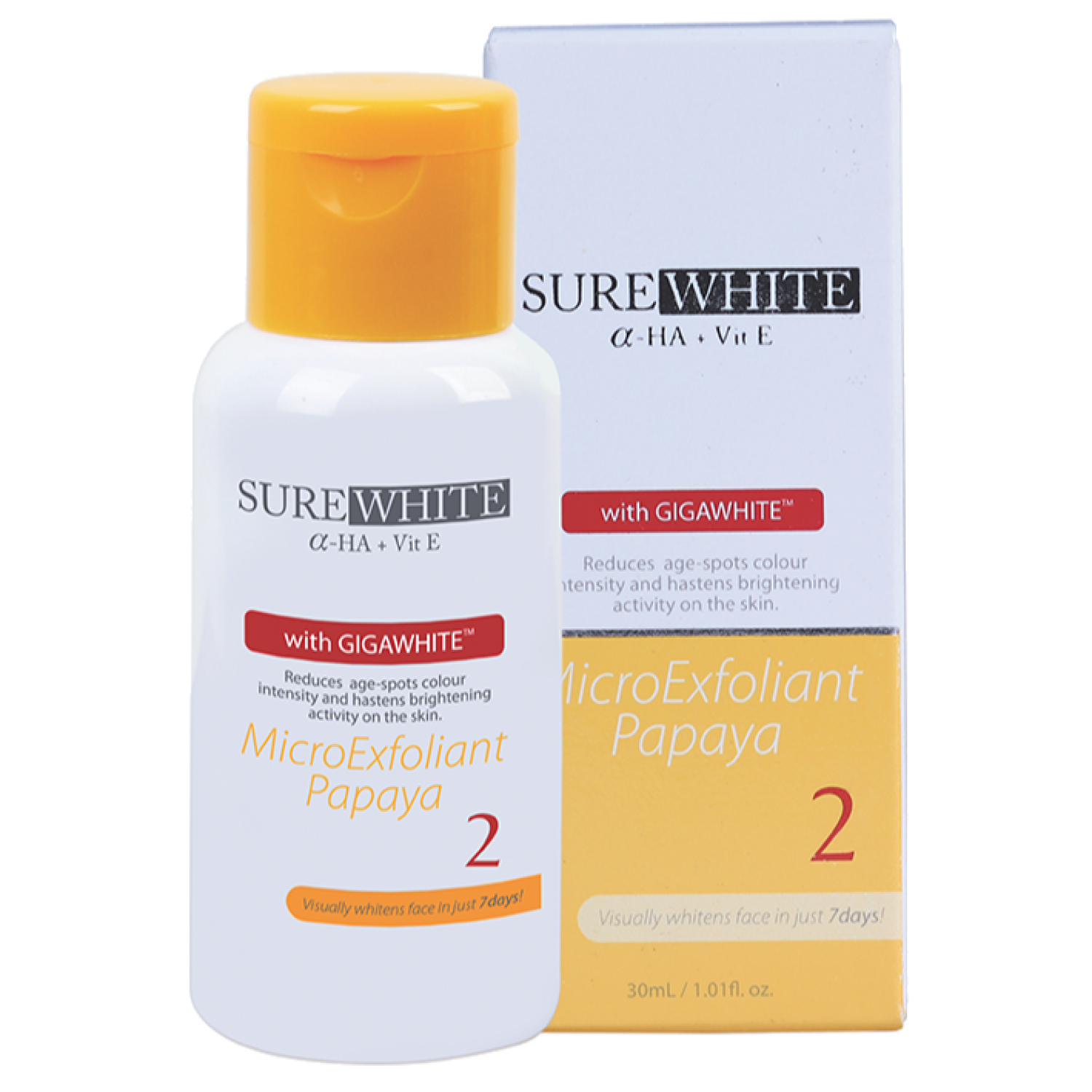Surewhite Papaya Microexfoliant contains dual whitening agents: Papaya Extract and gigawhite which is derived from seven Alpine plants that can brighten, even skin tone and reduce the color intensity of age spots. It also has Alpha Hydroxy Acids (AHA) for the moisturizing and exfoliating action to enhance skin cell renewal; and Vitamin E for a healthy and younger looking skin.