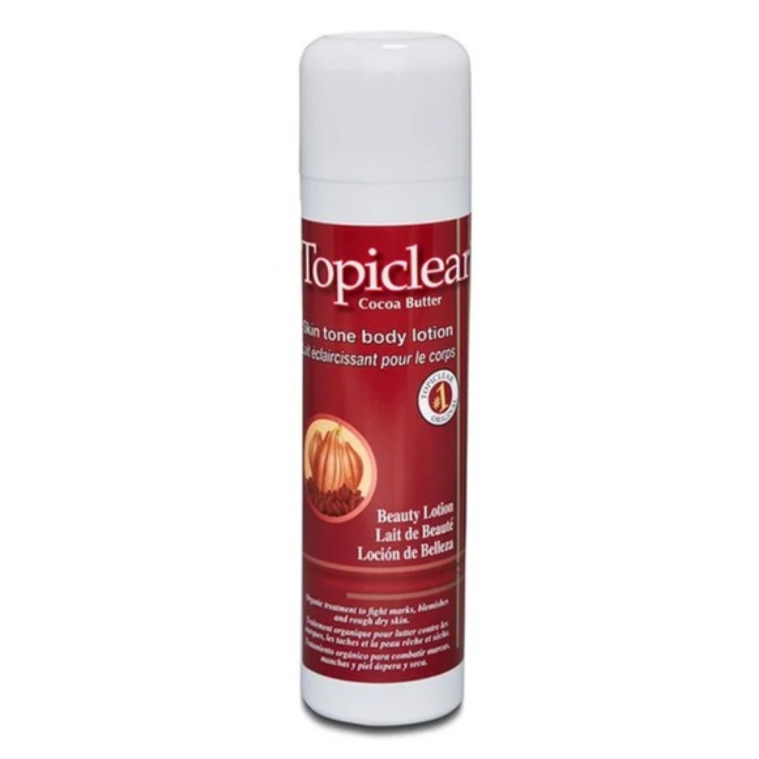 Topiclear Cocoa Butter Skin Body Lotion 16.8 oz With Cocoa Butter. Body care lotion for marks, blemishes and rough dry skin. Topiclear Cocoa butter body lotion is a milk enriched with Cocoa Butter and Vitamin E to even skin tone, helping eliminate spots and blemishes. It also helps improve skin misture, keeping it smooth and with a young and healty overall look.
