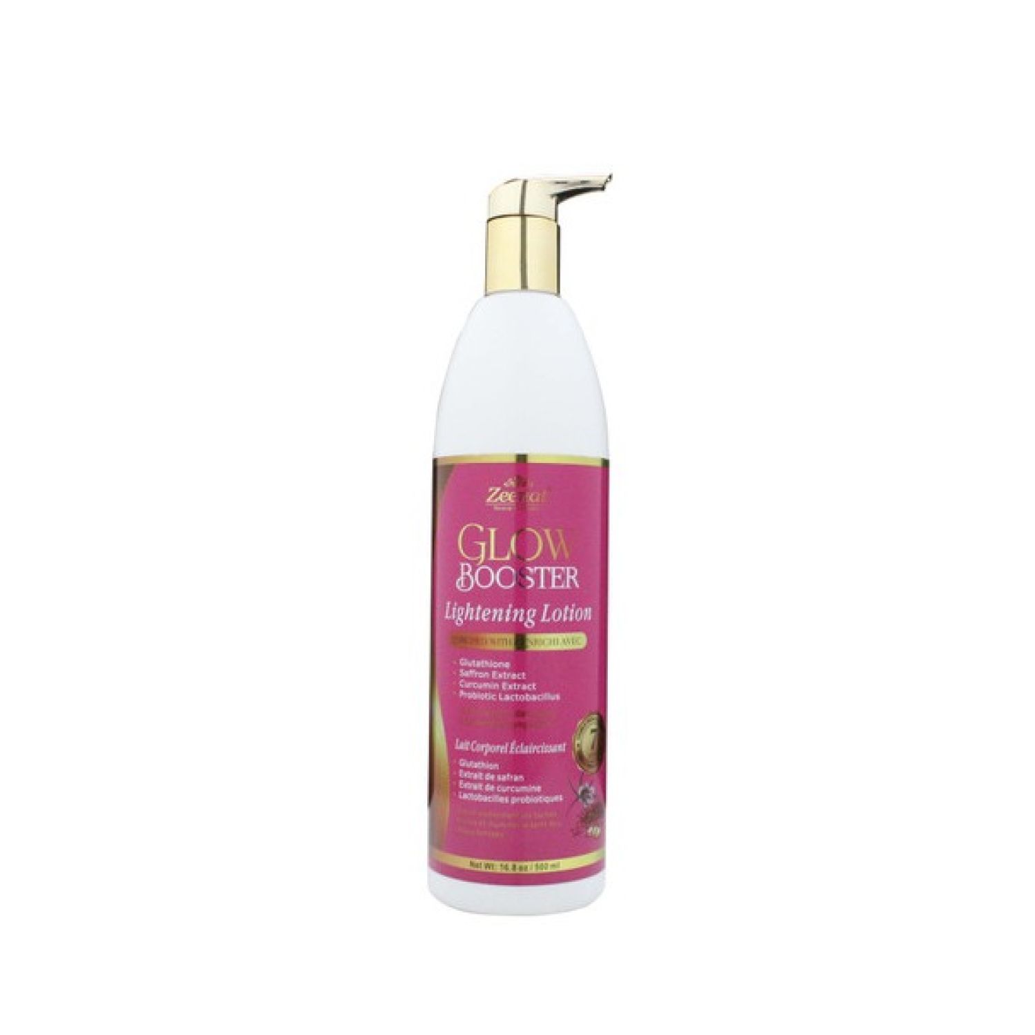 Zeenat Glow Booster is an ultra-rich Brightening and hydrating lotion that nourishes the skin while diminishing the appearance of visible spots, dullness and discoloration. It is formulated with active ingredients glutathione, saffron extract, curcumin extract and probiotic lactobacillus to maintain an even skin tone and prevent hyperpigmentation for a more even skin tone.